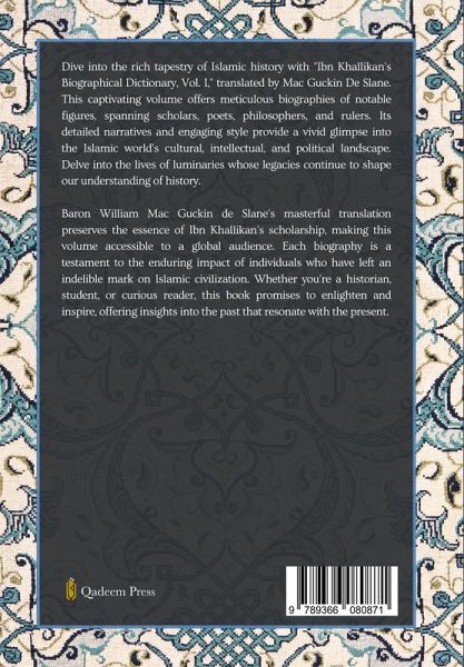 Step into the vibrant tapestry of Islamic history with Ibn Khallikan's Biographical Dictionary, Vol. I, translated by the renowned orientalist, Baron William Mac Guckin de Slane. This captivating volume invites you to explore the lives of the most influential figures of the Islamic world, meticulously chronicled by the esteemed scholar, Ahmad ibn Muhammad ibn Khallikan. Delve into a treasure trove of biographies spanning scholars, poets, philosophers, rulers, and other luminaries. Each narrative is meticulously crafted to bring the past to life, offering glimpses into the cultural, intellectual, and political landscape of Islamic civilization. Baron De Slane's masterful translation breathes new life into Ibn Khallikan's timeless work, preserving its essence and depth while making it accessible to readers worldwide. From profound scholarly achievements to captivating anecdotes, this volume serves as a gateway to discovery and exploration. Whether you're a seasoned historian, a student of literature and philosophy, or a curious reader, Ibn Khallikan's Biographical Dictionary, Vol. I offers an unparalleled journey through history, making it a must-have addition to any library. Embark on this extraordinary exploration today. Let the captivating narratives of Ibn Khallikan and De Slane's meticulous translation transport you through the annals of history. Discover the secrets of the past and enrich your understanding of the world we inhabit.