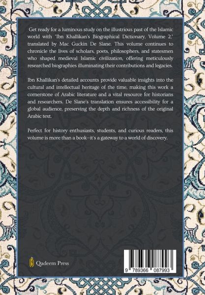 Dive into a profound historical enlightenment through the annals of Islamic history with "Ibn Khallikan's Biographical Dictionary, Volume 2", masterfully translated by the esteemed Mac Guckin De Slane. This monumental work, originally penned by the renowned scholar Ahmad ibn Muhammad ibn Khallikan, continues to unravel the rich tapestry of the Islamic world's most influential figures, offering a fascinating glimpse into the lives of scholars, poets, philosophers, and statesmen who shaped the intellectual and cultural heritage of medieval Islam. Volume 2 of this biographical dictionary delves deeper into the chronicles of history, presenting meticulously researched biographies that bring to life the extraordinary contributions and personal stories of notable individuals. Each entry is a testament to Ibn Khallikan's dedication to detail and scholarly rigor, providing readers with a comprehensive understanding of the achievements and legacies of these historical figures. This volume is not just a collection of biographies; it is a window into the past, offering valuable insights into the cultural, intellectual, and political landscapes of the medieval Islamic world. Readers will encounter luminaries whose ideas and deeds have left an indelible mark on history. From towering scholars whose works continue to influence contemporary thought, to poets whose verses still resonate with beauty and wisdom, each biography illuminates a different facet of the vibrant and diverse world of medieval Islam. The significance of "Ibn Khallikan's Biographical Dictionary" cannot be overstated. It stands as one of the most important biographical reference works in Arabic literature, providing indispensable primary source material for researchers and historians. The translation by Mac Guckin De Slane has opened up this treasure trove of knowledge to a global audience, ensuring the rich legacy of Islamic scholarship is accessible to all. For students of history, literature, and philosophy, as well as for curious readers eager to explore the past, "Ibn Khallikan's Biographical Dictionary, Volume 2" offers a profound and enriching experience. It invites you to step into the shoes of historical giants, to walk alongside them as they navigate the complexities of their time, and to witness the unfolding of their remarkable lives. Whether you are a seasoned historian seeking detailed biographical accounts, a student exploring Islamic civilization, or a casual reader with a thirst for knowledge, this book promises to enlighten, educate, and inspire. "Ibn Khallikan's Biographical Dictionary, Volume 2" is a timeless addition to any library, offering endless hours of discovery and reflection. Don't miss the opportunity to immerse yourself in the captivating narratives of Ibn Khallikan and the masterful translation by Mac Guckin De Slane. Let this remarkable volume transport you to a world of intellectual brilliance and cultural richness. Purchase your copy today and embark on a journey through history that will leave you enlightened and inspired!