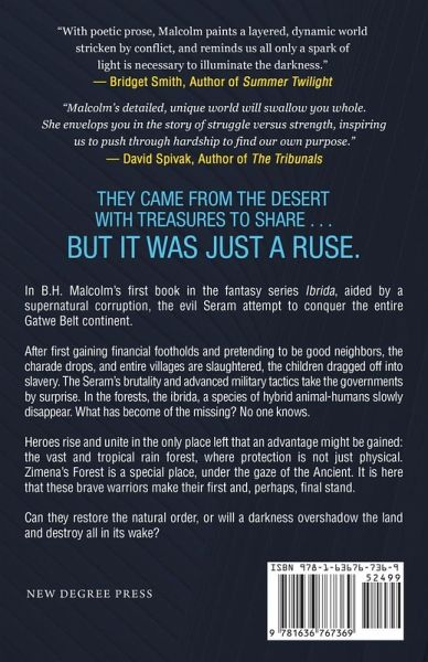 They came from the desert with treasures to share . . . but it was just a ruse. In B.H. Malcolm's first book in the fantasy series Ibrida: Restoration of the Natural Order, aided by a supernatural corruption, the evil Seram attempt to conquer the entire Gatwe Belt continent. After gaining financial footholds and pretending to be good neighbors, the charade drops, and entire villages are slaughtered and the children dragged off into slavery. The Seram's brutality and advanced military tactics take the governments by surprise. In the forests, the ibrida, a species of hybrid animal-humans slowly disappear. What has become of the missing? No one knows. Heroes rise and unite in the only place left where an advantage is possible: the vast and tropical rainforest, where protection is not just physical. Zimena's Forest is a special place, under the gaze of the Ancient. It is here that these brave warriors make their first and, perhaps, final stand. Can they restore the natural order, or will a darkness overshadow the land and destroy all in its wake?