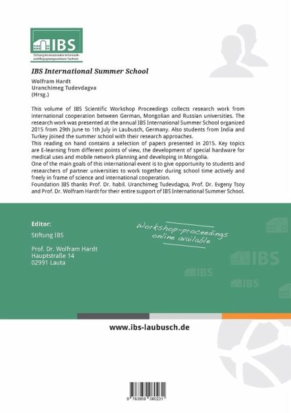 This volume of IBS Scientific Workshop Proceedings collects research work from international cooperation between German, Mongolian and Russian universities. The research work was presented at the annual IBS International Summer School organized 2015 from 29th June to 1th July in Laubusch, Germany. Also students from India and Turkey joined the summer school with their research approaches.This reading on hand contains a selection of papers presented in 2015. Key topics are E-learning from different points of view, the development of special hardware for medical uses and mobile network planning and developing in Mongolia.One of the main goals of this international event is to give opportunity to students and researchers of partner universities to work together during school time actively and freely in frame of science and international cooperation.Foundation IBS thanks Prof. Dr. habil. Uranchimeg Tudevdagva, Prof. Dr. Evgeny Tsoy and Prof. Dr. Wolfram Hardt for their entire supportof IBS International Summer School.