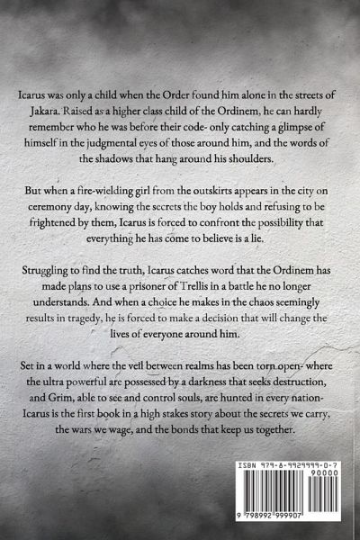 Icarus was only a child when the Order found him alone in the streets of Jakara. Raised as a higher class child of the Ordinem, he can hardly remember who he was before their code, only catching a glimpse of himself in the judgmental eyes of those around him, and the words of the shadows that hang around his shoulders. But when a fire-wielding girl from the outskirts appears in the city on ceremony day, knowing the secrets the boy holds and refusing to be frightened by them, Icarus is forced to confront the possibility that everything he has come to believe is a lie. Struggling to find the truth, Icarus catches word that the Ordinem has made plans to use a prisoner of Trellis in a battle he no longer understands. And when a choice he makes in the chaos seemingly results in tragedy, he is forced to make a decision that will change the lives of everyone around him. Set in a world where the veil between realms has been torn open-where the ultra-powerful are possessed by a darkness that seeks destruction, and Grim, able to see and control souls, are hunted in every nation-Icarus is the first book in a high-stakes story about the secrets we carry, the wars we wage, and the bonds that keep us together.