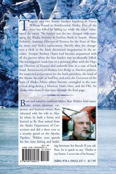 Tragedy met two Seattle bankers kayaking in Prince William Sound in Southcentral Alaska. One of the men was killed by falling ice while the other video-taped the event. The banker was the one charged with managing the Alaska Account at SeaFirst Bank in Seattle. Aliana Pedersen, Assistant Director of Finance for the State of Alaska, must now find a replacement. Shortly after the change-over a clerk in the bank discovered irregularities in the account. Trooper Reuben Hayes had become acquainted with all the parties when the first banker was accidentally killed. His investigation leads him to a personal affair with the Deputy Director of Finance and embroils him in a case of bank fraud. Reminiscent of Alaska's Last Bridge to Nowhere politics, the suspected perpetrators are the bank president, the head of the Alaska Account at SeaFirst, and even the Governor of the State of Alaska. Many others become entangled in the case: a local drug dealer, a Mexican Mafia Don, and the FBI. An Alaska who-done-it that lasts through the final page.