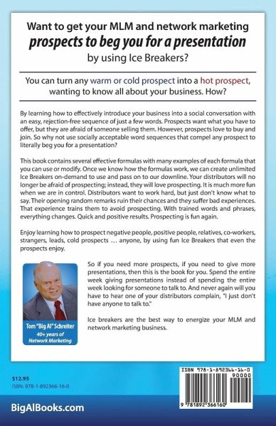 You can turn any warm or cold prospect into a hot prospect, wanting to know all about your business. How? By learning how to effectively introduce your business into a social conversation with an easy, rejection-free sequence of just a few words. Prospects want what you have to offer, but they are afraid of someone selling them. However, prospects love to buy and join. So why not use socially acceptable word sequences that compel any prospect to literally beg you for a presentation? This book contains several effective formulas with many examples of each formula that you can use or modify. Once we know how the formulas work, we can create unlimited Ice Breakers on-demand to use and pass on to our downline. Your distributors will no longer be afraid of prospecting; instead, they will love prospecting. It is much more fun when we are in control. Distributors want to work hard, but just don’t know what to say. Their opening random remarks ruin their chances and they suffer bad experiences. That experience trains them to avoid prospecting. But with trained words and phrases, everything changes. Quick and positive results. Prospecting is fun again. Enjoy learning how to prospect negative people, positive people, relatives, co-workers, strangers, leads, cold prospects … anyone, by using fun Ice Breakers that even the prospects enjoy. Spend the entire week giving presentations, instead of spending the entire week looking for someone to talk to. And never again will you have to hear one of your distributors complain, "I just don’t have anyone to talk to." Ice Breakers are the best way to energize your MLM and network marketing business.