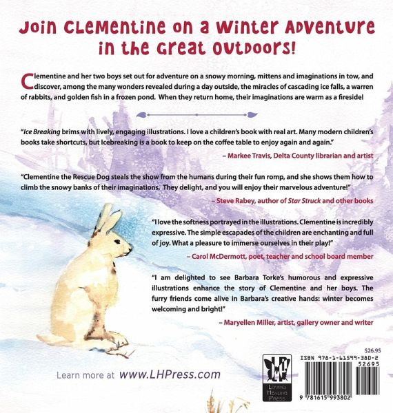 Join Clementine on a Winter Adventure in the Great Outdoors! Clementine and her two boys set out for adventure on a snowy morning, mittens and imaginations in tow, and discover, among the many wonders revealed during a day outside, the miracles of cascading ice falls, a warren of rabbits, and golden fish in a frozen pond. When they return home, their imaginations are warm as a fireside! "Ice Breaking brims with lively, engaging illustrations. I love a children's book with real art. Many modern children's books take shortcuts, but Icebreaking is a book to keep on the coffee table to enjoy again and again." -- Markee Travis, Delta County librarian and artist "Clementine the Rescue Dog steals the show from the humans during their fun romp, and she shows them how to climb the snowy banks of their imaginations. They delight, and you will enjoy their marvelous adventure!"" -- Steve Rabey, author of Star Struck and other books "I love the softness portrayed in the illustrations. Clementine is incredibly expressive. The simple escapades of the children are enchanting and full of joy. What a pleasure to immerse ourselves in their play!" -- Carol McDermott, poet, teacher and school board member "I am delighted to see Barbara Torke's humorous and expressive illustrations enhance the story of Clementine and her boys. The furry friends come alive in Barbara's creative hands: winter becomes welcoming and bright!" -- Maryellen Miller, artist, gallery owner and writer Learn more at www.LHPress.com