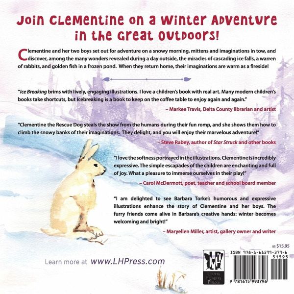 Join Clementine on a Winter Adventure in the Great Outdoors! Clementine and her two boys set out for adventure on a snowy morning, mittens and imaginations in tow, and discover, among the many wonders revealed during a day outside, the miracles of cascading ice falls, a warren of rabbits, and golden fish in a frozen pond. When they return home, their imaginations are warm as a fireside! "Ice Breaking brims with lively, engaging illustrations. I love a children's book with real art. Many modern children's books take shortcuts, but Icebreaking is a book to keep on the coffee table to enjoy again and again." -- Markee Travis, Delta County librarian and artist "Clementine the Rescue Dog steals the show from the humans during their fun romp, and she shows them how to climb the snowy banks of their imaginations. They delight, and you will enjoy their marvelous adventure!"" -- Steve Rabey, author of Star Struck and other books "I love the softness portrayed in the illustrations. Clementine is incredibly expressive. The simple escapades of the children are enchanting and full of joy. What a pleasure to immerse ourselves in their play!" -- Carol McDermott, poet, teacher and school board member "I am delighted to see Barbara Torke's humorous and expressive illustrations enhance the story of Clementine and her boys. The furry friends come alive in Barbara's creative hands: winter becomes welcoming and bright!" -- Maryellen Miller, artist, gallery owner and writer Learn more at www.LHPress.com