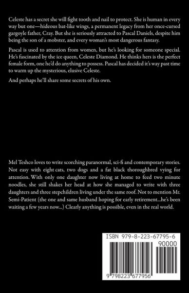 Celeste has a secret she will fight tooth and nail to protect. She is human in every way but one—hideous bat-like wings, a permanent legacy from her once-cursed gargoyle father, Cray. But she is seriously attracted to Pascal Daniels, despite him being the son of a mobster, and every woman's most dangerous fantasy. Pascal is used to attention from women, but he's looking for someone special. He's fascinated by the ice queen, Celeste Diamond. He thinks hers is the perfect female form, one he'd do anything to possess. Pascal has decided it's way past time to warm up the mysterious, elusive Celeste. And perhaps he'll share some secrets of his own.