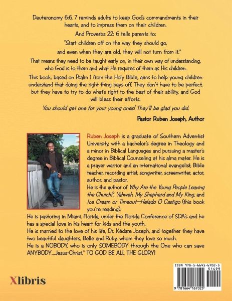 Deuteronomy 6:6, 7, NIV reminds adults to keep God's commandments in their hearts, and to impress them on their children. And Proverbs 22: 6 tells parents to: "Start children off on the way they should go, and even when they are old, they will not turn from it." That means they need to be taught early on, in their own way of understanding, who God is to them and what He requires of them as His children. This book, based on Psalm 1 from the Holy Bible, aims to help young children understand that doing the right thing pays off. They don't have to be perfect, but they have to try to do what's right to the best of their ability, and God will bless their efforts. You should get one for your young ones! They'll be glad you did. Pastor Ruben Joseph, Author