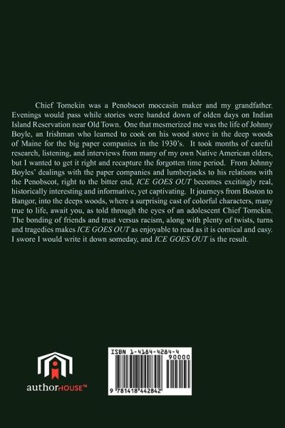 Chief Tomekin was a Penobscot moccasin maker and my grandfather. Evenings would pass while stories were handed down of olden days on Indian Island Reservation near Old Town. One that mesmerized me was the life of Johnny Boyle, an Irishman who learned to cook on his wood stove in the deep woods of Maine for the big paper companies in the 1930's. It took months of careful research, listening, and interviews from many of my own Native American elders, but I wanted to get it right and recapture the forgotten time period. From Johnny Boyles' dealings with the paper companies and lumberjacks to his relations with the Penobscot, right to the bitter end, Ice Goes Out becomes excitingly real, historically interesting and informative, yet captivating. It journeys from Boston to Bangor, into the deeps woods, where a surprising cast of colorful characters, many true to life, await you, as told through the eyes of an adolescent Chief Tomekin. The bonding of friends and trust versus racism, along with plenty of twists, turns and tragedies makes Ice Goes Out as enjoyable to read as it is comical and easy. I swore I would write it down someday, and Ice Goes Out is the result.