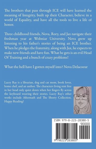 The brothers that pass through ICE will have learned the meaning of Integrity, built up their Character, believe in a world of Equality, and have all the tools to live a life of honor. Three childhood friends, Nova, Rory, and Jax navigate their freshman year at Wobniar University. Nova grew up listening to his father's stories of being an ICE brother. When he pledges the fraternity, along with Jax, he expects to make new friends and have fun. What he gets is an evil Head Of Training and a bunch of crazy problems! What the hell have I gotten myself into? Nova Delacoeur