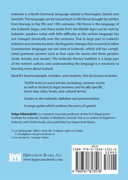 The most up-to-date two-way Icelandic dictionary available, from the author of popular textbook Beginner’s Icelandic! Icelandic is a North-Germanic language related to Norwegian, Danish and Swedish. The language can be traced back to Old Norse brought by settlers from Norway in the 9th and 10th centuries. Old Norse is the language of the Icelandic Sagas and these works from the Middle ages can be read by Icelandic speakers today with little difficulty as the written language has not changed drastically over the centuries. Ideal for businesspeople, travelers, and students, this dictionary features: Over 18,000 word-to-word entries, including common words as well as technical, legal, business and locally-specific terms (such as cities, foods, and cultural terms) Guides to the Icelandic alphabet and pronunciation Practical usage guide which outlines the parts of speech Due in large part to Iceland’s isolation and remote location, the linguistic changes that occurred in other Scandinavian languages are not seen in Icelandic, which still has complicated grammar systems such as four cases for nouns and three genders (male, female, and neuter). The Icelandic literary tradition is a large part of the nation’s culture and understanding the language is a necessity to learning more about Iceland.