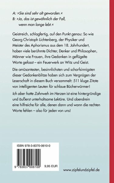 A: »Sie sind sehr alt geworden.«B: »Ja, das ist gewöhnlich der Fall, wenn man lange lebt.«Geistreich, schlagfertig, auf den Punkt genau: So wie Georg Christoph Lichtenberg, der Physiker und Meister des Aphorismus aus dem 18. Jahrhundert, haben viele berühmte Dichter, Denker und Philosophen, Männer wie Frauen, ihre Gedanken in geflügelte Worte gefasst - ein Feuerwerk an Witz und Geist.Die amüsantesten, besinnlichsten und scharfsinnigsten dieser Gedankenblitze haben sich zum Vergnügen der Leserschaft in diesem Buch versammelt: 511 kluge Zitate von intelligenten Leuten für schlaue Bücherwürmer!Ich aber hatte Zahnweh im Herzen ist eine hintergründige und äußerst unterhaltsame Lektüre. Und obendrein eine hilfreiche für alle, denen dann und wann die rechten Worte fehlen - also für jeden von uns!