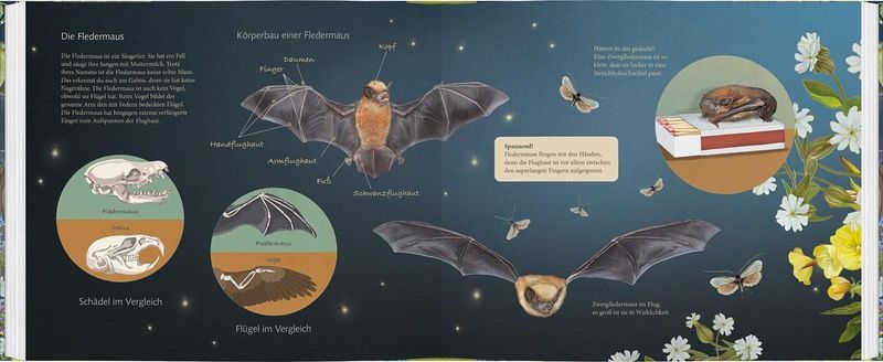 Die informativen Doppelseiten sind leicht verständlich gestaltet und vermitteln spannende Fakten über Fledermäuse, ohne zu überfordern. Die Illustrationen sind naturgetreu und gleichzeitig liebevoll gestaltet, wodurch das Buch eine warme, einladende Atmosphäre erhält.