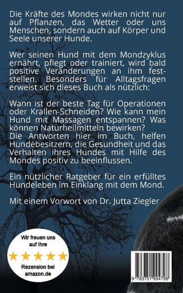 Die Kräfte des Mondes wirken nicht nur auf Pflanzen, das Wetter oder uns Menschen, sondern auch auf Körper und Seele unserer Hunde.Wer seinen Hund nach dem Mondzyklus ernährt, pflegt oder trainiert, wird bald positive Veränderungen an ihm feststellen. Besonders für Alltagsfragen erweist sich dieses Buch als nützlich. Wann ist der beste Tag für Operationen oder Krallenschneiden? Wie kann mein Hund mit Massagen entspannen? Was können Naturheilmittel bewirken? Die Antworten hier im Buch, helfen Hundebesitzern, die Gesundheit und Verhalten ihres Hundes mit Hilfe des Mondes positiv zu beeinflussen. Ein nützlicher Ratgeber für ein erfülltes Hunde-Leben im Einklang mit dem Mond.Mit einem Vorwort von Dr. Jutta Ziegler