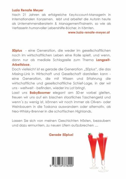 50plus - eine Generation, die weder im gesellschaftlichen noch im wirtschaftlichen Leben eine Rolle spielt, und wenn, dann nur als mediale Schlagzeile zum Thema Langzeit-Arbeitslose.Doch vielleicht ist es gerade die Generation 50plus, die das Missing-Link in Wirtschaft und Gesellschaft darstellt. Eine Generation, die mit Wissen und Erfahrung die wirtschaftliche und gesellschaftliche Schief-Lage, in der wir uns weltweit befinden, wieder ins Lot bringen kann.Lasst uns BabyBoomer elegant am 50-er vorbei gleiten, freuen wir uns auf ein bisschen stattliches Taschengeld, uns wenn´s zu wenig ist, können wir noch immer als Oliven- oder Weinbauern in die Toskana auswandern, oder als Neo-Whisky-Brenner in die Schottischen Highlands. Slàinte mhath !Lassen Sie sich von meinen Geschichten trösten, bezaubern und dazu ermuntern, zu neuen Ufern aufzubrechen: Gerade 50plus!