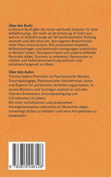 In diesem Buch gibt der Autor wertvolle Impulse für eine Selbstfürsorge, die mehr ist als Erholung. Er führt aus, warum er Selbstfürsorge als Teil professioneller Haltung versteht und lädt dazu ein, den eigenen Bedürfnissen mehr Platz einzuräumen. Mit praxisnahen Kapiteln, Reflexionsfragen und konkreten Anregungen unterstützt er Berater:innen, Therapeut:innen und andere helfende Personen dabei, Grenzen zu erkennen, Ressourcen zu stärken und Selbstverantwortung achtsam und verantwortungsvoll zu leben.
