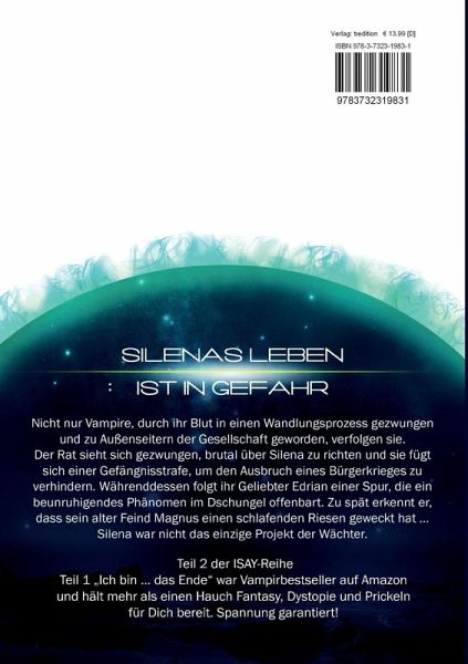 Silenas Leben ist in Gefahr. Nicht nur Vampire, durch ihr Blut in einen Wandlungsprozess gezwungen und zu Außenseitern der Gesellschaft geworden, verfolgen sie. Der Rat sieht sich gezwungen, brutal über Silena zu richten und sie fügt sich einer Gefängnisstrafe, um den Ausbruch eines Bürgerkrieges zu verhindern. Währenddessen folgt ihr Geliebter Edrian einer Spur, die ein beunruhigendes Phänomen im Dschungel offenbart. Zu spät erkennt er, dass sein alter Feind Magnus einen schlafenden Riesen geweckt hat ... Silena war nicht das einzige Projekt der Wächter.SciFi-Fantasy-Roman, Teil 2 der ISAY-Reihe