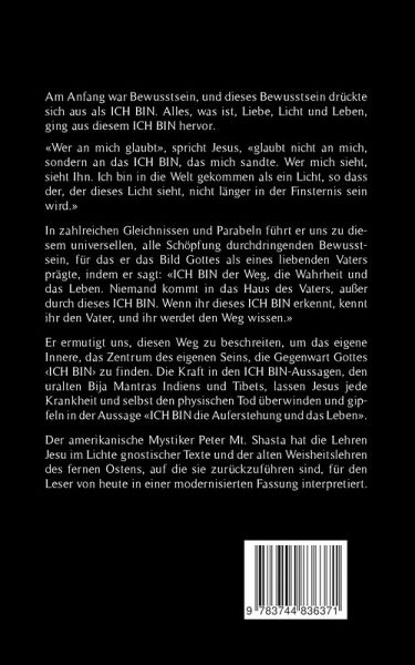 Am Anfang war Bewusstsein, und dieses Bewusstsein drückte sich aus als ICH BIN. Alles, was ist - Liebe, Licht und Leben - ging aus diesem ICH BIN hervor.«Wer an mich glaubt», spricht Jesus, «glaubt nicht an mich, sondern an das ICH BIN, das mich sandte. Wer mich sieht, sieht Ihn. Ich bin in die Welt gekommen als ein Licht, so dass der, der dieses Licht sieht, nicht länger in der Finsternis sein wird.»In zahlreichen Gleichnissen und Parabeln führt er uns zu diesem universellen, alle Schöpfung durchdringenden Bewusstsein, für das er das Bild Gottes als eines liebenden Vaters prägte, indem er sagt: «ICH BIN der Weg, die Wahrheit und das Leben. Niemand kommt in das Haus des Vaters, außer durch dieses ICH BIN. Wenn ihr dieses ICH BIN erkennt, kennt ihr den Vater, und ihr werdet den Weg wissen.»Er ermutigt uns, diesen Weg zu beschreiten, um das eigene Innere, das Zentrum des eigenen Seins, die Gegenwart Gottes «ICH BIN» zu finden. Die Kraft in den ICH BIN Aussagen, in den uralten Bija Mantras Indiens und Tibets, lassen Jesus jede Krankheit und selbst den physischen Tod überwinden und gipfeln in der Aussage «ICH BIN die Auferstehung und das Leben». Der amerikanische Mystiker Peter Mt. Shasta hat die Lehren Jesu im Lichte gnostischer Texte und der alten Weisheitslehren des fernen Ostens, auf die sie zurückzuführen sind, für den Leser von heute in einer modernisierten Fassung interpretiert.