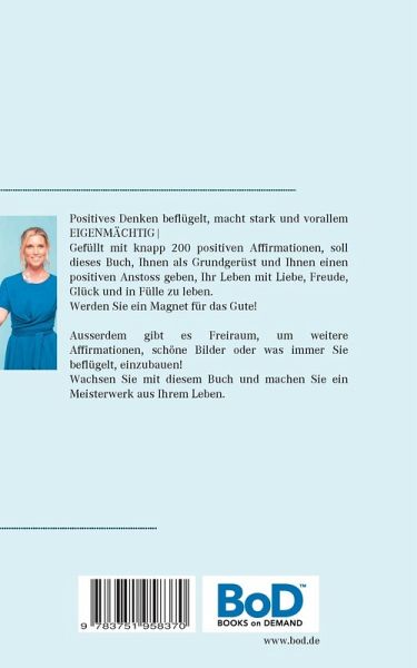 Positives Denken beflügelt, macht stark und vorallem EIGENMÄCHTIG Gefüllt mit knapp 200 positiven Affirmationen, soll dieses Buch, Ihnen als Grundgerüst und Ihnen einen positiven Anstoss geben, Ihr Leben mit Liebe, Freude, Glück und in Fülle zu leben.Werden Sie ein Magnet für das Gute!Ausserdem gibt es Freiraum, um weitere Affirmationen, schöne Bilder oder was immer Sie beflügelt, einzubauen!Wachsen Sie mit diesem Buch und machen Sie ein Meisterwerk aus Ihrem Leben.