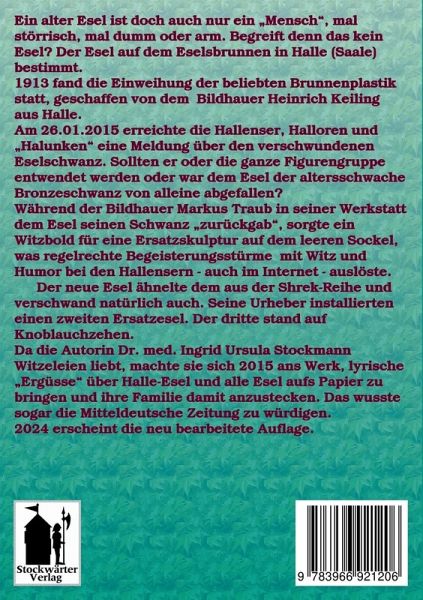 Ein alter Esel ist doch auch nur ein "Mensch", mal störrisch, mal dumm oder arm. Begreift denn das kein Esel? Der Esel auf dem Eselsbrunnen in Halle (Saale) bestimmt. 1913 fand die Einweihung der beliebten Brunnenplastik statt, geschaffen von dem Bildhauer Heinrich Keiling aus Halle. Am 26.01.2015 erreichte die Hallenser, Halloren und "Halunken" eine Meldung über den verschwundenen Eselschwanz. Sollten er oder die ganze Figurengruppe entwendet werden oder war dem Esel der altersschwache Bronzeschwanz von alleine abgefallen? Während der Bildhauer Markus Traub in seiner Werkstatt dem Esel seinen Schwanz "zurückgab", sorgte ein Witzbold für eine Ersatzskulptur auf dem leeren Sockel, was regelrechte Begeisterungsstürme mit Witz und Humor bei den Hallensern - auch im Internet - auslöste. Der neue Esel ähnelte dem aus der Shrek-Reihe und verschwand natürlich auch. Seine Urheber installierten einen zweiten Ersatzesel. Der dritte stand auf Knoblauchzehen. Da die Autorin Dr. med. Ingrid Ursula Stockmann Witzeleien liebt, machte sie sich 2015 ans Werk, lyrische "Ergüsse" über Halle-Esel und alle Esel aufs Papier zu bringen und ihre Familie damit anzustecken. Das wusste sogar die Mitteldeutsche Zeitung zu würdigen. 2024 erscheint die neu bearbeitete Auflage.