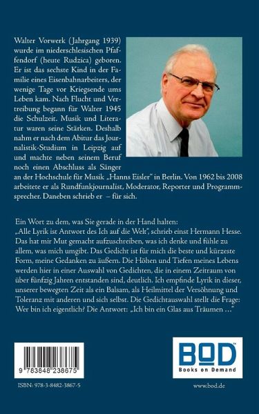 Ein Wort zu dem, was Sie gerade in der Hand halten:"Alle Lyrik ist Antwort des Ich auf die Welt", schrieb einst Hermann Hesse. Das hat mir Mut gemacht aufzuschreiben, was ich denke und fühle zu allem, was mich umgibt. Das Gedicht ist für mich die beste und kürzeste Form, meine Gedanken zu äußern. Die Höhen und Tiefen meines Lebens werden hier in einer Auswahl von Gedichten, die in einem Zeitraum von über fünfzig Jahren entstanden sind, deutlich. Ich empfinde Lyrik in dieser, unserer bewegten Zeit als ein Balsam, als Heilmittel der Versöhnung und Toleranz mit anderen und sich selbst. Die Gedichtauswahl stellt die Frage: Wer bin ich eigentlich? Die Antwort: "Ich bin ein Glas aus Träumen ..."