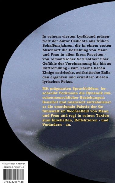 Der Autor stellt in diesem Band eine Auswahl lyrischer Arbeiten vor, die um das Thema einer Nahbeziehung kreisen. E. Perkmann deckt in intensiven Bildern eine breite Palette des zwischen einem Liebespaar Möglichen - von distanzloser Verliebtheit über Entfremdung bis hin zu destruktiven Phasen - ab. Ergänzt wird diese Auswahl durch Erzählgedichte und Balladen, die einen ganz anderen Aspekt ansprechen: Der Autor zeigt sich sarkastisch, witzig und systemkritisch und beweist in Rhythmus und Reim, dass er "die Lyra", das lyrische Handwerk souverän beherrscht.