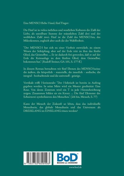 Eine MENSCHliche Hand, fünf Finger:Die Fünf ist in vielen östlichen und westlichen Kulturen die Zahl der Liebe, als unteilbare Summe der männlichen Zahl drei und der weiblichen Zahl zwei. Fünf ist die Zahl des MENSCHen, des Mikrokosmos, zugleich aber auch die der Wahlfreiheit. Der MENSCH hat sich zu einer Vierheit entwickelt, zu einem Wesen der Schöpfung, aber auf der Erde tritt zu ihm das fünfte Glied, das Geistselbst. - - - Er ist dadurch frei geworden, daß er auf der Erde die Keimanlage zu dem fünften Glied, dem Geistselbst, bekommen hat. (Rudolf Steiner, GA 101, S. 177 ff.)In diesem Roman betrachten wir fünf Ebenen des MENSCHseins: die äußere, die körperlich - materielle, die innerlich - seelische, die integral - beobachtende und die universell - geistige.Vertikale trifft Horizontale: Der Holztisch ist bereits in Auftrag gegeben worden. In seine Mitte wird ein Muster geschnitzt - Eine Rose. Von deren Zentrum wird ein T in jede Himmelsrichtung zeigen. Zusammen bilden sie ein Kreuz. Die fünf Elemente der Schnitzerei symbolisieren den Menschen. (Ich bin, Mensch, S. 77)Kann der Mensch der Zukunft so leben, dass das individuelle Menschsein, das globale Menschsein und das Universum als DREIKLANG im EINKLANG tönen werden?