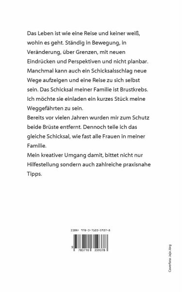 Eine Familie mit einer Genmutation, dass alle Frauen an Brustkrebs erkranken, meine persönlicher Weg, über die Entfernung beider Brüste und dennoch zu erkranken. Mein kreativer Umgang damit, der vielen Betroffenen Hilfestellung und Tipps auf Augenhöhe bittet.