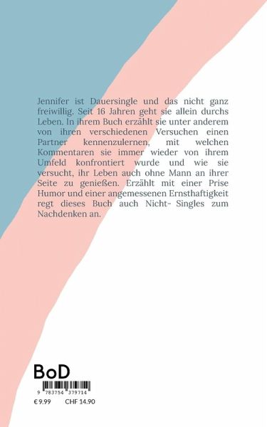 Jennifer ist Dauersingle und das nicht ganz freiwillig. Seit 16 Jahren geht sie allein durchs Leben. In ihrem Buch erzählt sie unter anderem von ihren verschiedenen Versuchen einen Partner kennenzulernen, mit welchen Kommentaren sie immer wieder von ihrem Umfeld konfrontiert wurde und wie sie versucht, ihr Leben auch ohne Mann an ihrer Seite zu genießen. Erzählt mit einer Prise Humor und einer angemessenen Ernsthaftigkeit regt dieses Buch auch Nicht-Singles zum Nachdenken an.