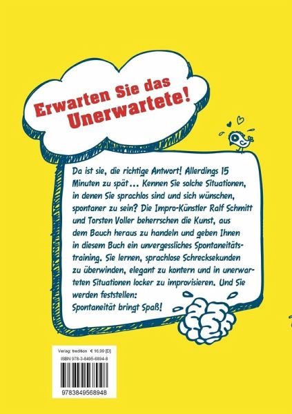 Da ist sie, die richtige Antwort! Allerdings 15 Minuten zu spät Wie gerne wäre man schlagfertiger gewesen! Die gute Nachricht: Spontaneität ist erlernbar. Torsten Voller und Ralf Schmitt sind Profis in Sachen Spontansein: Sie touren mit ihrer eigenen Impro-Show und machen in Coachings zum Thema "Business Impro" steife Schlipsträger locker. In ihrem Buch zeigen die beiden, wie man seinen Alltag mit ungeahnten Wendungen würzt, indem man einfach mal Ja sagt und öfter aus dem Bauch heraus entscheidet.
