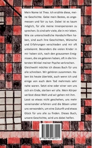 Mein Name ist Thea. Ich erzähle diese, meine Geschichte. Gebe mein Bestes, es angemessen und fair zu tun. Dabei ist es kaum möglich, für alle meine Innenpersonen zu sprechen. Es sind sehr viele, die in mir leben. Wie sie unterschiedliche Handschriften haben, sind auch ihre Geschichten, Wünsche und Erfahrungen verschieden und mir oft unbekannt. Besonders die vielen Kinder in mir haben sich, nach den grausamen Ereignissen, die sie geboren haben, oft in die hintersten Winkel meiner Psyche verkrochen. Gleichwohl möchte ich dieses Buch für uns alle schreiben. Wir gehören zusammen. Haben bis heute überlebt, auch wenn ich und einige von euch dem Tod mehrmals sehr nahe waren. Setzt eine oder einer von uns sich ein Ende, sterben wir alle. Mein Körper verlässt diese Welt und wir gehen mit ihm.Lasst so etwas nicht geschehen, uns mehr voneinander erfahren und die Bösen unter uns verwandeln, um eine Zukunft und etwas Glück für uns alle zu finden. Dieses Buch, unsere Geschichte, wird uns dabeihelfen.