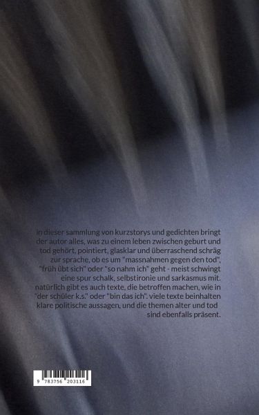In dieser sammlung von kurzstorys und gedichten bringt der autor alles, was zu einem leben zwischen geburt und tod gehört, pointiert, glasklar und überraschend schräg zur sprache, ob es um "massnahmen gegen den tod", "früh übt sich" oder "so nahm ich" geht - meist schwingt auch eine spur schalk, selbstironie und sarkasmus mit. aber natürlich gibt es auch texte, die betroffen machen, wie in "der schüler k.s." oder "bin das ich". viele texte beinhalten klare politische aussagen, und die themen alter und tod sind ebenfalls präsent.