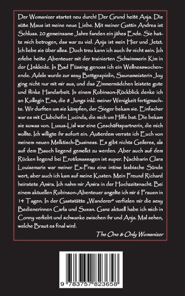 Der Womanizer startet neu durch. Der Grund heißt Anja. Die süße Maus ist meine neue Liebe. Mit meiner Gattin Andrea ist Schluss. 20 gemeinsame Jahre fanden ein jähes Ende. Sie hatte mich betrogen, das war zu viel. Anja ist mein Hier und Jetzt. Ich liebe sie über alles. Doch treu kann ich auch ihr nicht sein. Ich erlebe heiße Abenteuer mit der trainierten Schwimmerin Kim in der Umkleide. In Bad Füssing genoss ich ein Wellnesswochenende. Adele wurde zur sexy Bettgespielin, Saunameisterin Joy ging nicht nur mit mir aus, und das Zimmermädchen leistete gute und flinke Handarbeit. In einem Robinson-Rückblick denke ich an Kollegin Ena, die 8 Jungs inkl. meiner Wenigkeit fertigmachte. Wir mussten um sie kämpfen, der Sieger bekam sie. Einfacher war es mit Clubchefin Lucinda, die mich um Hilfe bat. Die bekam sie sowas von. Luxus-Lisl war eine Geschäftspartnerin, die mich wollte. Ich willigte ihr sofort ein. Außerdem verrate ich Euch von meinem neuen Melktisch-Business. Es gibt nichts Geileres, als auf dem Bauch liegend abgemelkt zu werden. Aber auch auf dem Rücken liegend bei Erotikmassagen ist super. Nachbarin Clara Louisemarie war meiner Ex-Frau eine intime lesbische Sünde wert, aber auch ich kam auf meine Kosten. Mein Freund Richard heiratete Amira. Ich nahm mir Amira in der Hochzeitsnacht. Bei einem aktuellen Robinson-Abenteuer angelte ich mir 6 Frauen in 14 Tagen. In der Gaststätte Wanderer verfielen mir die sexy Bedienerinnen Carla und Susan. Ganz aktuell habe ich mich in Conny verliebt und schwanke zwischen ihr und Anja. Mal sehen, welche Braut es final wird.