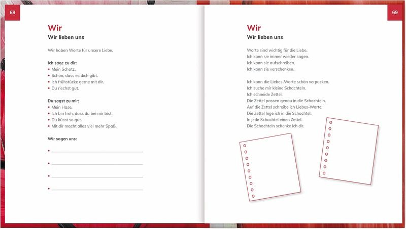 Es ist ein interaktives Buch für Menschen in einer Partnerschaft. Mit freien Seiten zum Ausfüllen, Malen und Mitgestalten lädt es dazu ein, eigene Erlebnisse und Gefühle zu reflektieren und festzuhalten.