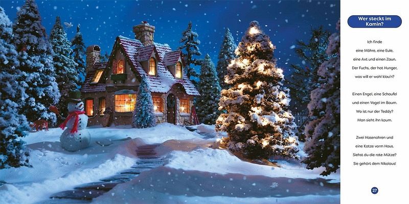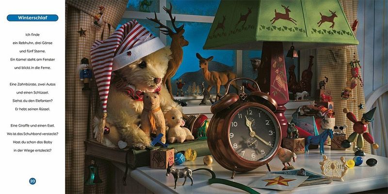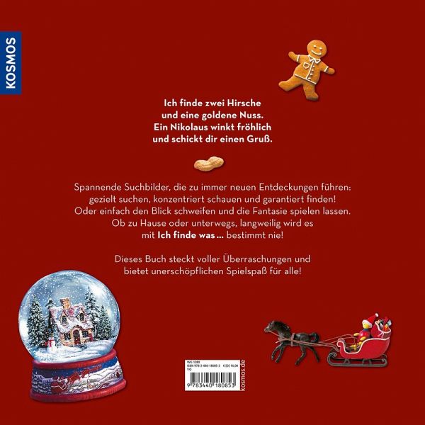 Welche Farben haben die Weihnachtskugeln? Wo ist der Weihnachtsmann mit seinem Schlitten? Was ist auf dem zugefrorenen See alles los? Zauberhafte Winterlandschaften sind auf 15 großformatigen Fotos zu sehen. Welche Gegenstände werden auf den Wimmelbildern gesucht? Das verraten lustige Rätsel in Reimform. Auch weitere Überraschungen sind in den Bildern versteckt. Wer entdeckt die gesuchten Details zuerst? Beobachten, konzentrieren, darüber sprechen: Mit den Foto-Suchbildern auf eine fantasievolle Reise gehen und die Zeit bis Weihnachten spielerisch verkürzen. Ein großer Suchspaß für die ganze Familie.
