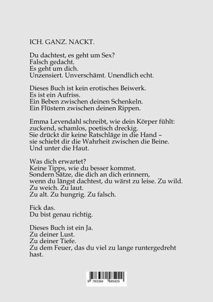 ICH. GANZ. NACKT.Ein Buch wie ein Zucken.Ein Text wie eine Berührung unter der Gürtellinie - aber mitten ins Herz.Du denkst, du kennst deine Lust?Du denkst, du weißt, was Nähe ist?Du denkst, du müsstest dich nur noch ein bisschen mehr zusammenreißen, dann passt du endlich?Falsch, Babe.Dieses Buch reißt dir nicht nur den Slip vom Leib.Es reißt dir auch die Scham vom Herz.Hier geht's nicht um perfekte Orgasmen.Sondern um echte.Nicht um Hochglanz-Körper.Sondern um solche, die gelebt haben. Gelitten. Gebrannt.Du wirst dich wiedererkennen -in den Zeilen, die flüstern, lecken, schreien.In den Sätzen, die dich erinnern, was du wirklich bist:Wild. Weich. Unverschämt lebendig.Dieses Buch ist kein Ratgeber.Es ist ein Aufstand.Und eine Einladung:Komm. Ganz. Bei dir an.Und dann: Zieh dich aus.Für niemanden - außer dich selbst.