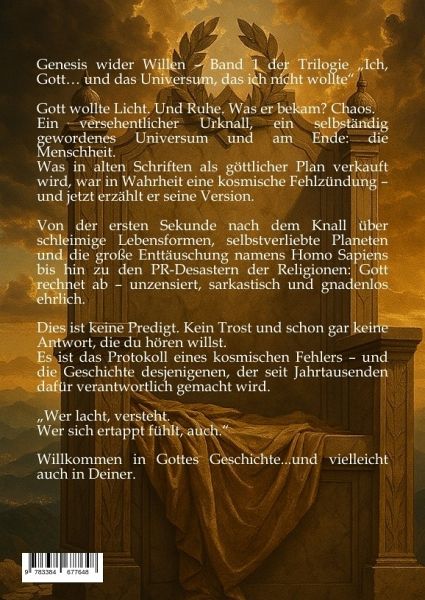 Gott meldet sich zurück. Nicht mit Posaunen, sondern mit spitzer Feder und einem ziemlich klaren Fazit: Das Universum war nie gewollt - und der Mensch definitiv nicht das Sahnehäubchen der Schöpfung. In diesem ersten Band der Trilogie blickt der Schöpfer selbst auf das Chaos, das er einst ins Rollen brachte: den Urknall, das Leben, die Sprache, die Moral - und all die absurden Ideen, die der Mensch daraus gebastelt hat. Zwischen kosmischem Sarkasmus, göttlicher Verzweiflung und erstaunlich menschlicher Einsicht zieht Gott Bilanz: messerscharf, böse, ironisch - und überraschend nahbar. Kein religiöses Manifest. Kein Dogma. Sondern eine literarische Abrechnung mit der Schöpfung, wie sie wirklich war: aus Versehen genial, oft peinlich - und immer ein bisschen zu menschlich.