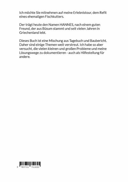 Ich möchte Sie mitnehmen auf meine Erlebnistour, dem Refit eines ehemaligen Fischkutters. Der trägt heute den Namen HANNES, nach einem guten Freund, der aus Büsum stammt und seit vielen Jahren in Griechenland lebt. Dieses Buch ist eine Mischung aus Tagebuch und Baubericht. Daher sind einige Themen weit verstreut. Ich habe so aber versucht, die vielen kleinen und großen Probleme und meine Lösungswege zu dokumentieren - auch als Hilfestellung für andere.