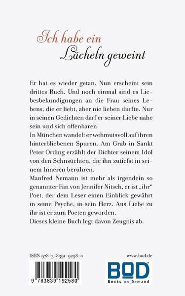 Er hat es wieder getan. Nun erscheint sein drittes Buch. Und noch einmal sind es Liebesbekundigungen an die Frau seines Lebens, die er liebt, aber nie lieben durfte. Nur in seinen Gedichten darf er seiner Liebe nahe sein und sich offenbaren.In München wandelt er wehmutsvoll auf ihren hinterbliebenen Spuren. Am Grab in Sankt Peter Ording erzählt der Dichter seinem Idol von den Sehnsüchten, die ihn zutiefst in seinem Inneren berühren.Manfred Nemann ist mehr als irgendein so genannter Fan von Jennifer Nitsch, er ist "ihr" Poet, der dem Leser einen Einblick gewährt in seine Psyche, in sein Herz.Aus Liebe zur ihr ist er zum Poeten geworden.Dieses kleine Buch legt davon Zeugnis ab.