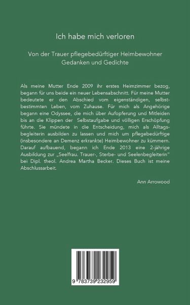 Dieses Buch handelt von einer speziellen Trauer. Einer Trauer, die pflegebedürftigen Heimbewohnern häufig nicht zugestanden wird, was die Angst oft noch verstärkt und Verzweiflung angesichts der Ausweglosigkeit hervorruft. Denn der Pfad der Trauer führt über den Verlust zuerst der Gesundheit, dann der Selbstbestimmtheit und zuletzt des eigenen Zuhauses und mündet früher oder später ins Sterben. Das Pflegeheim ist "die letzte Station". Eine Trauerbegleitung dieser Art kann also direkt in eine Sterbebegleitung hinüberwechseln. J. William Wordens Traueraufgabe "Aussicht und Hoffnung auf ein neues Leben" wird in dieser besonderen Situation zum Synonym für den Übergang ins Jenseits.Als meine Mutter Ende 2009 ihr erstes Heimzimmer bezog, begann für uns beide ein neuer Lebensabschnitt. Für meine Mutter bedeutete er den Abschied vom eigenständigen, selbstbestimmten Leben, vom Zuhause. Für mich als Angehörige begann eine Odyssee, die mich über Aufopferung und Mitleiden bis an die Klippen der Selbstaufgabe und völligen Erschöpfung führte. Sie mündete in die Entscheidung, mich als Alltagsbegleiterin ausbilden zu lassen und mich um pflegebedürftige (insbesondere an Demenz erkrankte) Heimbewohner zu kümmern. Darauf aufbauend, begann ich Ende 2013 eine 2-jährige Ausbildung zur "Seelfrau. Trauer-, Sterbe- und Seelenbegleiterin" bei Dipl. theol. Andrea Martha Becker. Dieses Buch ist meine Abschlussarbeit.