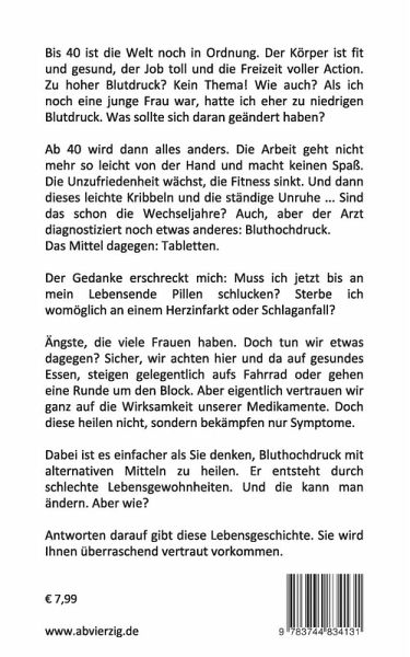 Bis 40 ist die Welt noch in Ordnung. Der Körper ist fit und gesund, der Job toll und die Freizeit voller Action. Zu hoher Blutdruck? Kein Thema! Wie auch? Als ich noch eine junge Frau war, hatte ich eher zu niedrigen Blutdruck. Was sollte sich daran geändert haben? Ab 40 wird dann alles anders. Die Arbeit geht nicht mehr so leicht von der Hand und macht keinen Spaß. Die Unzufriedenheit wächst, die Fitness sinkt. Und dann dieses leichte Kribbeln und die ständige Unruhe ... Sind das schon die Wechseljahre? Auch, aber der Arzt diagnostiziert noch etwas anderes: Bluthochdruck. Das Mittel dagegen: Tabletten.Der Gedanke erschreckt mich: Muss ich jetzt bis an mein Lebensende Pillen schlucken? Sterbe ich womöglich an einem Herzinfarkt oder Schlaganfall? Ängste, die viele Frauen haben. Doch tun wir etwas dagegen? Sicher, wir achten hier und da auf gesundes Essen, steigen gelegentlich aufs Fahrrad oder gehen eine Runde um den Block. Aber eigentlich vertrauen wir ganz auf die Wirksamkeit unserer Medikamente. Doch diese heilen nicht, sondern bekämpfen nur Symptome. Dabei ist es einfacher als Sie denken, Bluthochdruck mit alternativen Mitteln zu heilen. Er entsteht durch schlechte Lebensgewohnheiten. Und die kann man ändern. Aber wie? Antworten darauf gibt diese Lebensgeschichte. Sie wird Ihnen überraschend vertraut vorkommen.