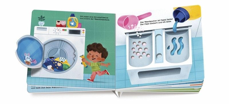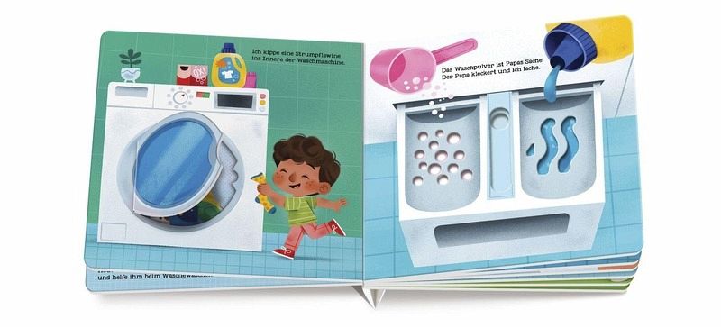 Heute ist Waschtag: Fröhlich gereimtes Pappbilderbuch für Kinder ab 2 Jahren mit robusten Schiebe- und Drehelementen. Die Waschmaschine bedienen: Die stabilen Klappen, Schiebe- und Drehelemente laden zum Nachspielen ein und schulen nebenbei die Koordination bei Kindern. Schleudergang, Schaum und Socken: Einprägsame Reime und bunte Illustrationen machen das Wäsche sortieren und Wäsche aufhängen zu einem lustigen Erlebnis. Im Haushalt helfen: Das von Montessori inspirierte Mitmachbuch fördert spielerisch die Selbstständigkeit von Kindern ab 2 Jahren. Geprüfte Qualität: Das Spielbuch unterliegt strengen Sicherheitsanforderungen und regelmäßigen Kontrollen nach europäischer Spielzeugsicherheitsrichtlinie.
