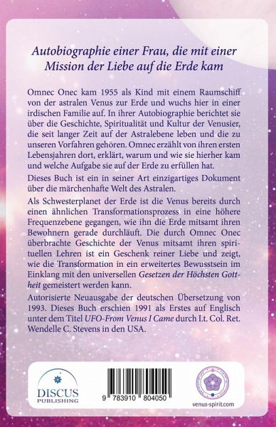 Autobiographie einer Frau, die mit einer Mission der Liebe auf die Erde kam Omnec Onec kam 1955 als Kind mit einem Raumschiff von der astralen Venus zur Erde und wuchs hier in einer irdischen Familie auf. In ihrer Autobiographie berichtet sie über die Geschichte, Spiritualität und Kultur der Venusier, die seit langer Zeit auf der Astralebene leben und die zu unseren Vorfahren gehören. Omnec erzählt von ihren ersten Lebensjahren dort, erklärt, warum und wie sie hierher kam und welche Aufgabe sie auf der Erde zu erfüllen hat. Dieses Buch ist ein in seiner Art einzigartiges Dokument über die märchenhafte Welt des Astralen. Als Schwesterplanet der Erde ist die Venus bereits durch einen ähnlichen Transformationsprozess in eine höhere Frequenzebene gegangen, wie ihn die Erde mitsamt ihren Bewohnern gerade durchläuft. Die durch Omnec Onec überbrachte Geschichte der Venus mitsamt ihren spirituellen Lehren ist ein Geschenk reiner Liebe und zeigt, wie die Transformation in ein erweitertes Bewusstsein im Einklang mit den universellen Gesetzen der Höchsten Gottheit gemeistert werden kann. Autorisierte Neuausgabe der deutschen Übersetzung von 1993. Dieses Buch erschien 1991 als Erstes auf Englisch unter dem Titel UFO-From Venus I Came durch Lt. Col. Ret. Wendelle C. Stevens in den USA.