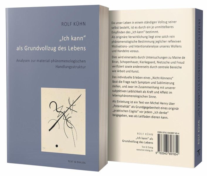 Da unser Leben in einem ständigen Vollzug seiner selbst besteht, ist es durch ein je unmittelbares Empfinden des "Ich kann" bestimmt. Als originäre Verwirklichung liegt eine solch rein phänomenologische Bestimmung jeglicher reflexiven Motivations- und Intentionalanalyse unseres Wollens und Handelns voraus. Dies wird einerseits durch Untersuchungen zu Maine de Biran, Schopenhauer, Kierkegaard, Nietzsche und Freud verifiziert sowie andererseits durch zentrale Bereiche wie Arbeit und Kunst. Das individuelle Erleben eines "Nicht-Könnens" lässt die Frage nach Symptom und Sublimierung stellen, und zwar im Zusammenhang mit unserer subjektiven Leiblichkeit als Kraft und Affekt im lebensphänomenologischen Sinne. Als Einleitung ist ein Text von Michel Henry über "Potentialität" als Grundgegebenheit eines originär "praktischen Cogito" vor jedem "Ich denke" beigegeben, was als Leitfaden dienen kann.