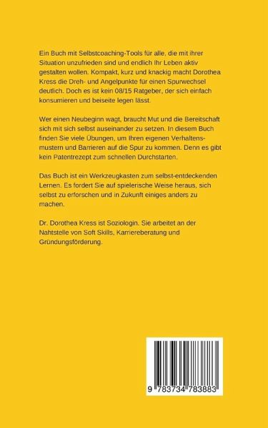 Ein Buch mit Selbstcoaching-Tools für alle, die mit ihrer Situation unzufrieden sind und endlich ihr Leben aktiv gestalten wollen. Kompakt, kurz und knackig macht Dorothea Kress die Dreh- und Angelpunkte für einen Spurwechsel deutlich. Doch es ist kein 08/15 Ratgeber, der sich einfach konsumieren und beiseite legen lässt.Wer einen Neubeginn wagt, braucht Mut und die Bereitschaft sich mit sich selbst auseinander zu setzen. In diesem Buch finden Sie viele Übungen, um Ihren eigenen Verhaltensmustern und Barrieren auf die Spur zu kommen. Denn es gibt kein Patentrezept zum schnellen Durchstarten. Das Buch ist ein Werkzeugkasten für den Aufbruch zu neuen Lebenszielen. Es fordert Sie auf spielerische Weise heraus, sich selbst zu erforschen und in Zukunft einiges anders zu machen.