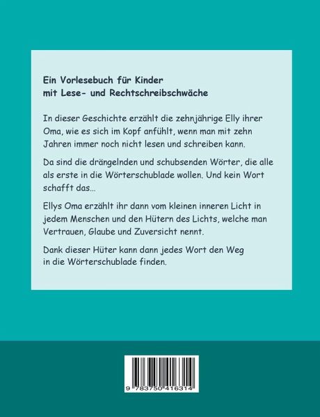 Ein Vorlesebuch für Kindermit Lese- und RechtschreibschwächeIn dieser Geschichte erzählt die zehnjährige Elly ihrer Oma,wie es sich in ihrem Kopf so anfühlt, wenn man immer noch nichtlesen und schreiben kann.Da sind die drängelnden und schubsenden Wörter, die alleals erste in die Wörterschublade wollen. Und kein Wortschafft das...Ellys Oma erzählt ihr dann vom kleinen inneren Licht injedem Menschen und den Hütern des Lichts, welche manVertrauen, Glaube und Zuversicht nennt.Dank dieser Hüter kann dann jedes Wort den Wegin die Wörterschublade finden.