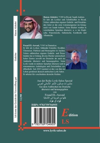 Hatem Alshehri, *1989 in Riyad, Saudi-Arabien. Er lebt als Lyriker und Schriftsteller in Riyad, Neben zahlreichen eigenen Gedicht- und Prosabänden leitet er die erste Literaturagentur im Königreich von Saudi-Arabien. Seine Bücher wurden in verschiedene Sprachen übersetzt, u. a. ins Englische, Französische, und Italienische.