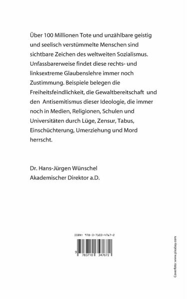 Über 100 Millionen Tote und unzählbare geistig und seelisch verstümmelte Menschen sind sichtbare Zeichen des weltweiten Sozialismus. Unfassbarerweise findet diese rechts- und linksextreme Glaubenslehre immer noch Zustimmung. Beispiele belegen die Freiheitsfeindlichkeit, die Gewaltbereitschaft und den Antisemitismus dieser Ideologie, die immer noch in Medien, Religionen, Schulen und Universitäten durch Lüge, Zensur, Tabus, Einschüchterung, Umerziehung und Mord herrscht.Dr. Hans-Jürgen Wünschel Akademischer Direktor a.D.