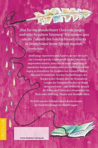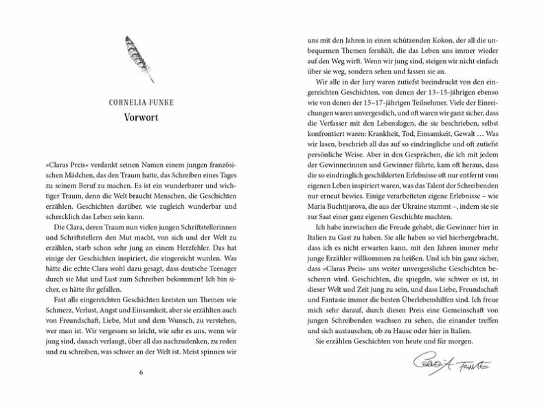 Die international erfolgreichste deutsche Kinder- und Jugendbuchautorin Cornelia Funke hat mit "Claras Preis" eine neue Plattform geschaffen, die junge Schriftsteller_innen ermutigt, ihre Stimme zu finden und zu teilen. Der Erlös des Buches unterstützt einen guten Zweck und kommt der Charité in Berlin zugute.