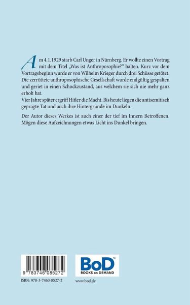 Am 4.1.1929 starb Carl Unger in Nürnberg. Er wollte einen Vortrag mit dem Titel "Was ist Anthroposophie?" halten. Kurz vor dem Vortragsbeginn wurde er von Wilhelm Krieger durch drei Schüsse getötet.Die zerrüttete anthroposophische Gesellschaft wurde endgültig gespalten und geriet in einen Schockzustand, aus welchem sie sich nie mehr ganz erholt hat.Vier Jahre später ergriff Hitler die Macht.Bis heute liegen die antisemitisch geprägte Tat und auch ihre Hintergründe im Dunkeln.Der Autor dieses Werkes ist auch einer der tief im Innern Betroffenen.Mögen diese Aufzeichnungen etwas Licht ins Dunkel bringen.