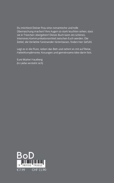 Du möchtest Deiner Frau eine romantische und tolle Überraschung machen? Ihre Augen so stark leuchten sehen, dass sie in Tränchen übergehen? Dieses Buch kann ein schönes, intensives Kommunikationsmittel zwischen Euch werden. Die Zettel, die Verliebte füreinander hinterlassen, finden hier Gefühl. Legt es in die Flure, neben das Bett und nehmt es mit auf Reise. HaltetKomplimente, Kosungen und gemeinsame Idee darin fest.Eure Mutter Hautberg(In Liebe versteht sich)